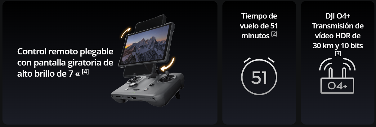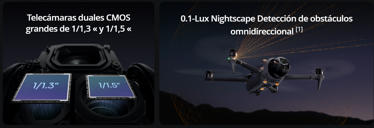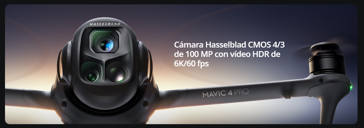 Cámara principal Hasselblad de 100 MP, telecámaras duales CMOS grandes, cardán infinito con rotación de 360°, detección de obstáculos omnidireccional Nightscape de 0,1-lux, transmisión de vídeo O4+...DJI Mavic 4 Pro cambia las reglas del juego y cuenta con características de vanguardia que redefinen nuestra tecnología y llevan las imágenes de drones DJI y el rendimiento de vuelo a niveles sin precedentes. Este dron insignia de triple cámara está diseñado para transformar la forma de crear y explorar nuevos horizontes en la fotografía aérea.