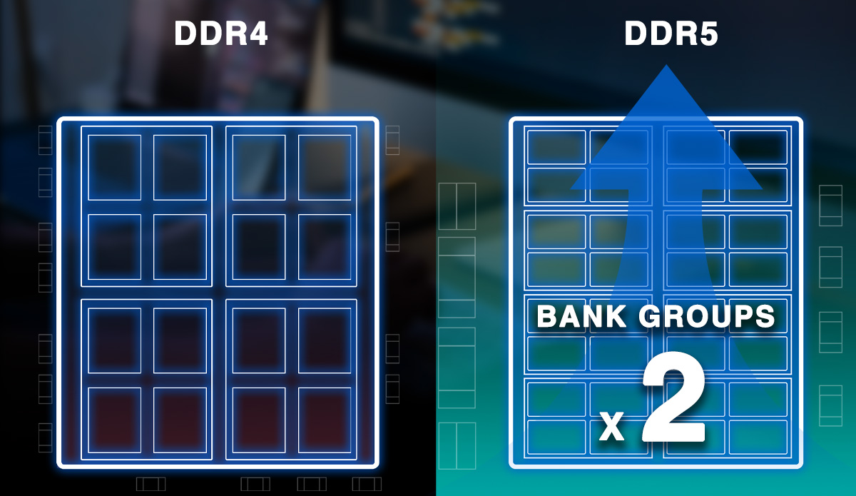 La arquitectura de este módulo de memoria permite más grupos de bancos y bancos de memoria. Con la misma área, se pueden empaquetar más grupos de bancos en el módulo, duplicando lo que era posible con DDR4, proporcionándole mayores capacidades.