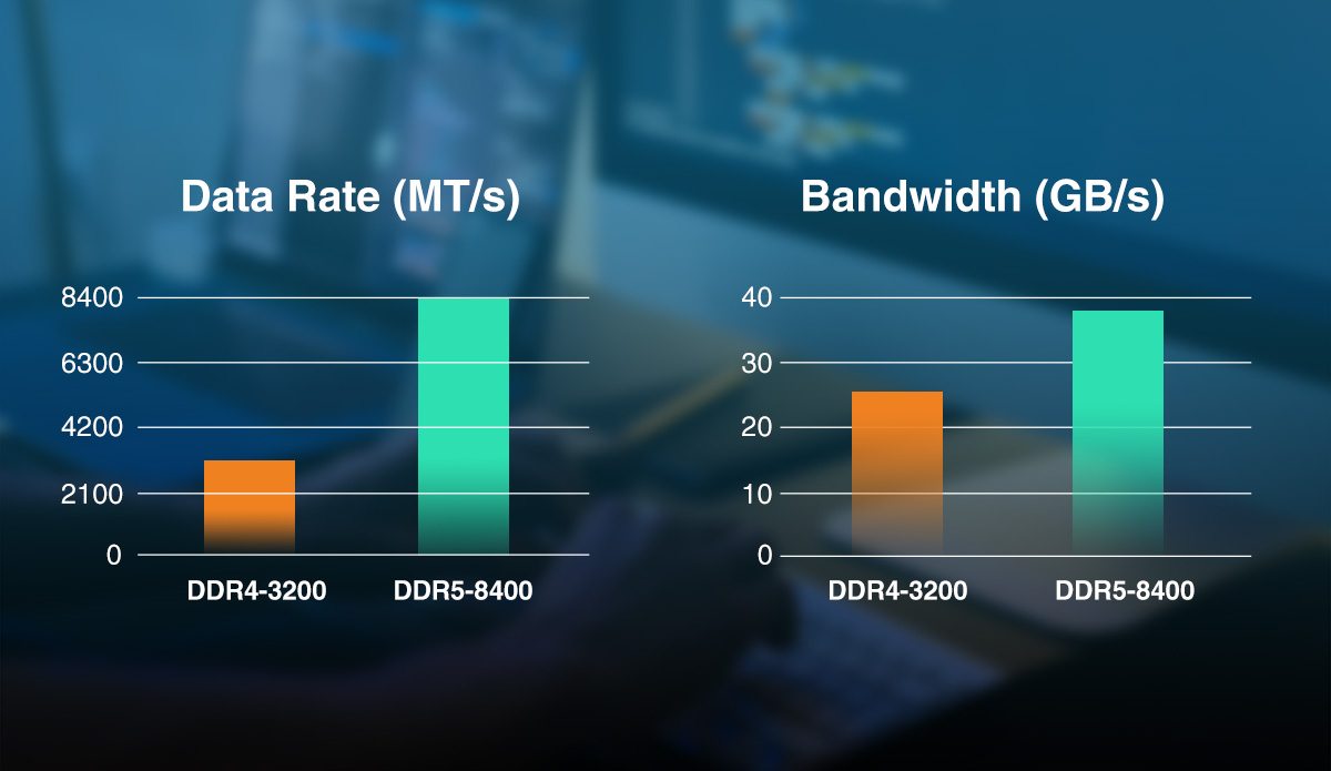 El mayor cambio es que el ancho de banda y la frecuencia son significativamente más altos. Los módulos de memoria ADATA DDR5 ofrecen frecuencias de hasta 4800 MT/s y cuentan con un ancho de banda de 38,4 GB/s, que es un 50 % más alto que el DDR4-3200. La frecuencia máxima se incrementa 1,63 veces en comparación con DDR4.