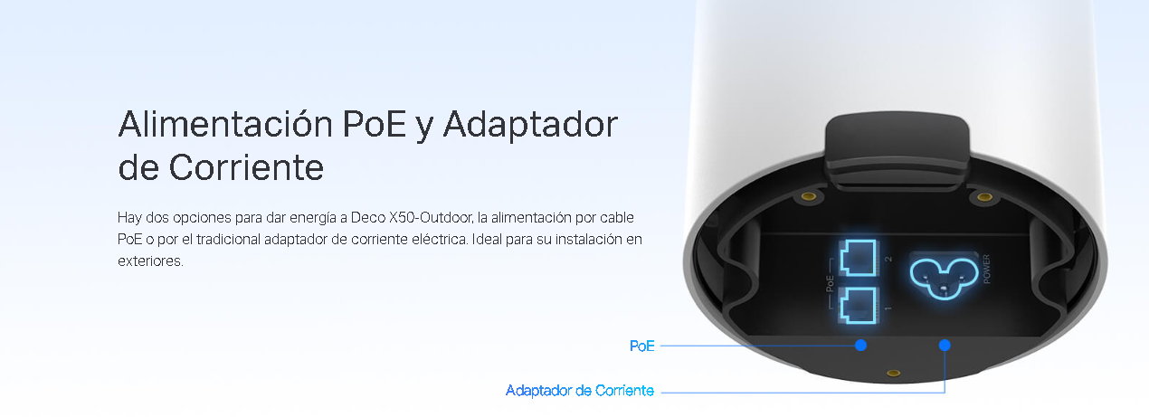 Deco X50-Outdoor está herméticamente cerrado para resistir en exteriores en condiciones de lluvia, polvo y temperaturas extremas.  Así garantiza una señal Wi-Fi potente al aire libre. La alimentación por adaptador de corriente o cable PoE permite una fácil instalación.