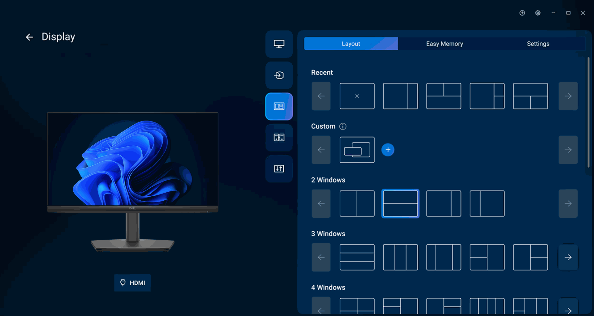 EasyArrange organiza las aplicaciones en las pantallas con particiones preestablecidas y permite personalizar hasta cinco ventanas, lo que mejora el trabajo multitarea. EasyArrange Memory guarda y restaura los perfiles de aplicaciones manualmente, según una programación o al iniciar el equipo.
