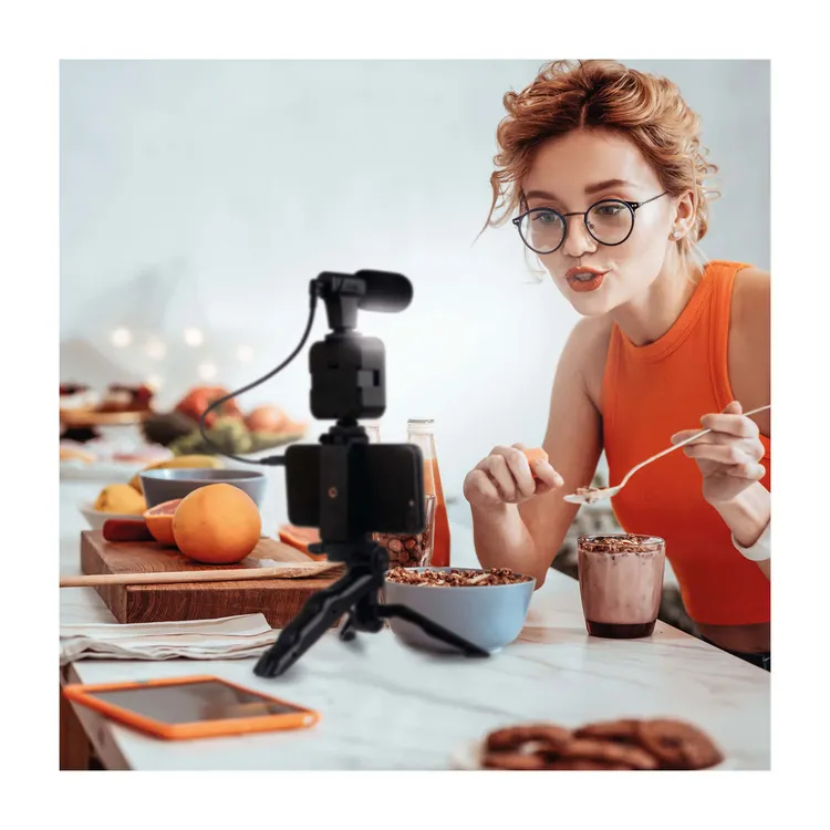 Kit Vlogger VTA, para los amantes a la tecnología y redes sociales, versátil para grabación de videos, transmisiones en vivo e incluso selfies y fotografía. Incluye: Trípode ajustable, soporte para smartphone, lámpara LED y micrófono.