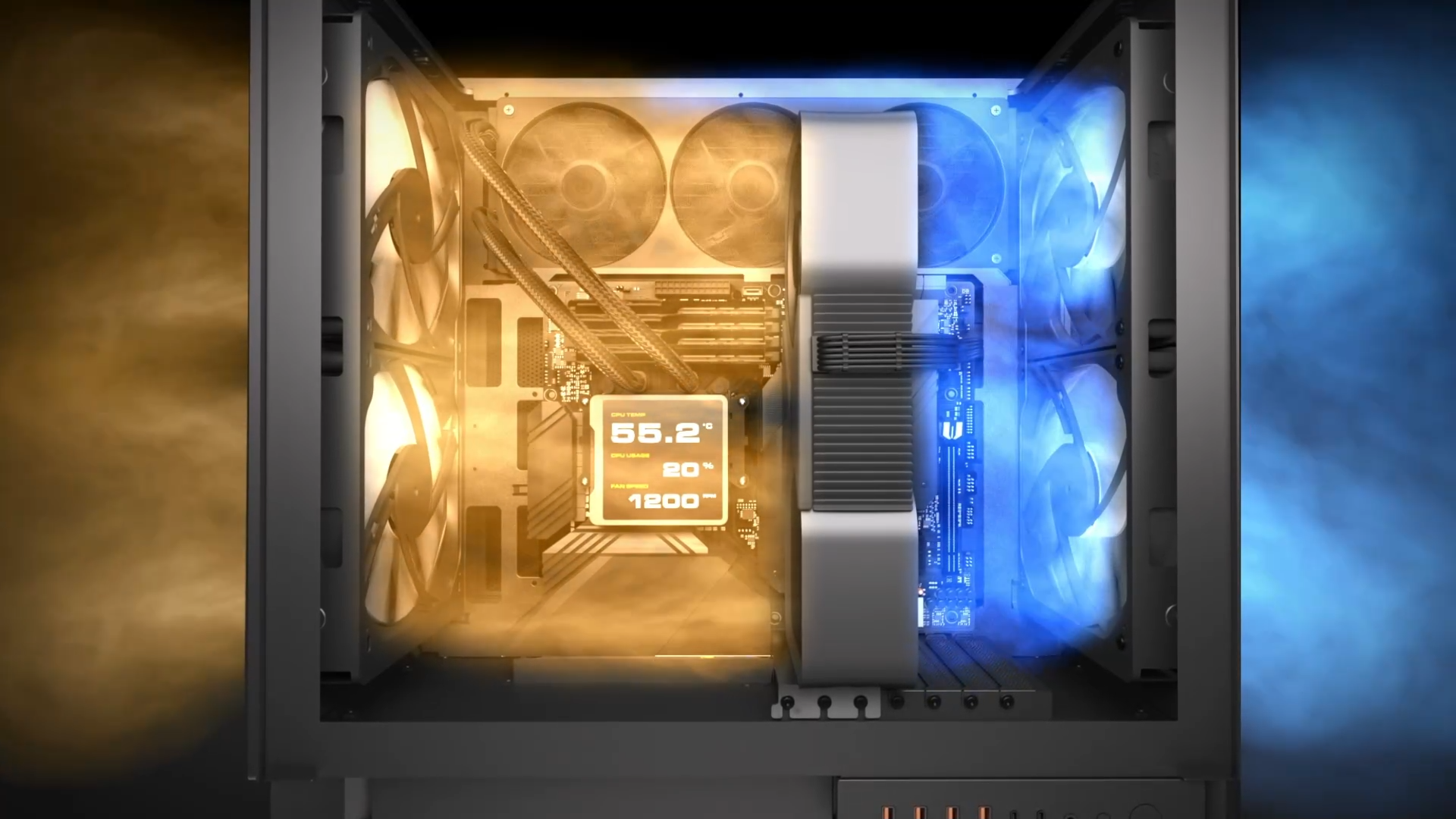 Al bloquear una capacidad absoluta de ventilador frontal y trasero reflejada, se maximiza el área de superficie de la GPU en contacto con un flujo de aire constante y máximo , independientemente de la orientación de la carcasa.