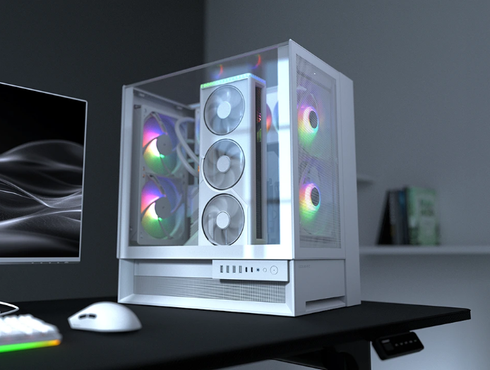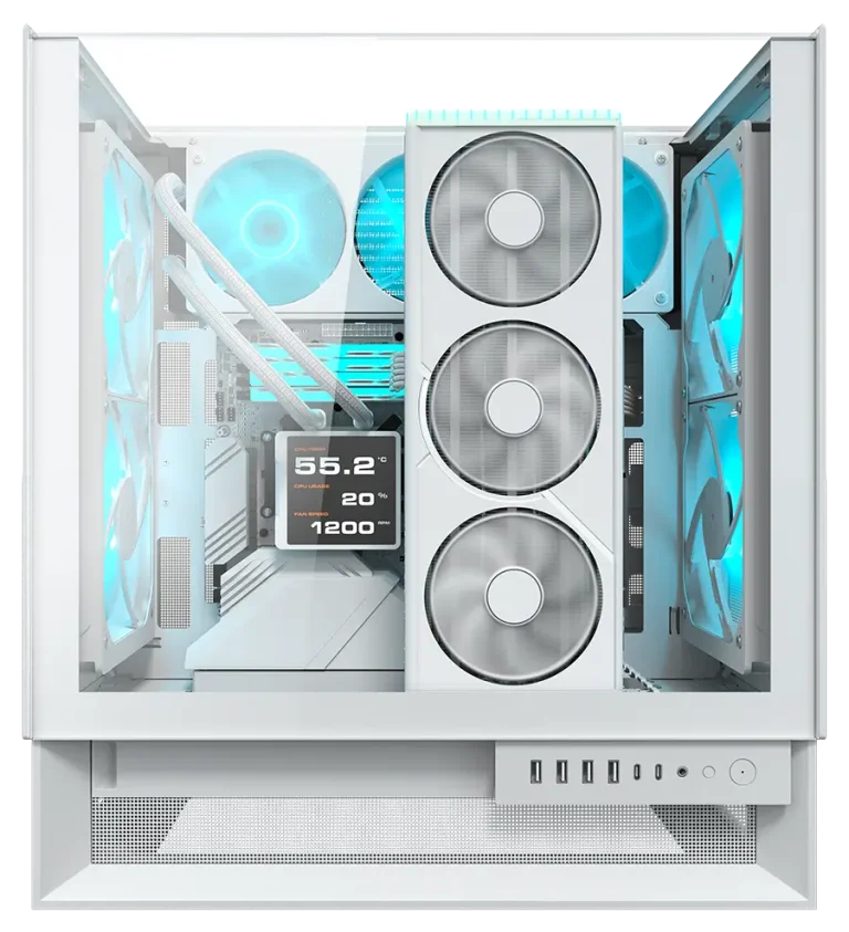 Su diseño perfectamente simétrico permite una total libertad de orientación. Con dos paneles de vidrio transparente que permiten visualizar tu equipo desde cualquier ángulo, el OmnyX luce espectacular, ya sea a la derecha, a la izquierda o al centro.