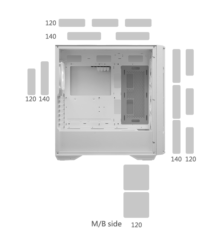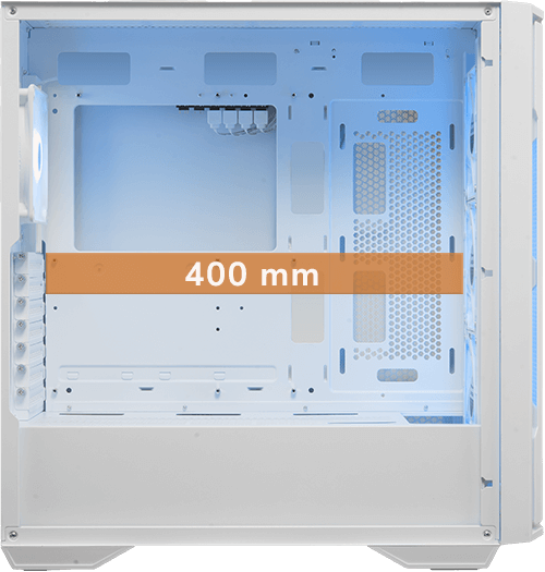 Diseñada para acomodar una longitud máxima de GPU de 400 mm con opciones de orientación horizontal/vertical sin soporte, esta torre media proporciona el espacio que necesita para construir y ampliar su equipo según sus necesidades.