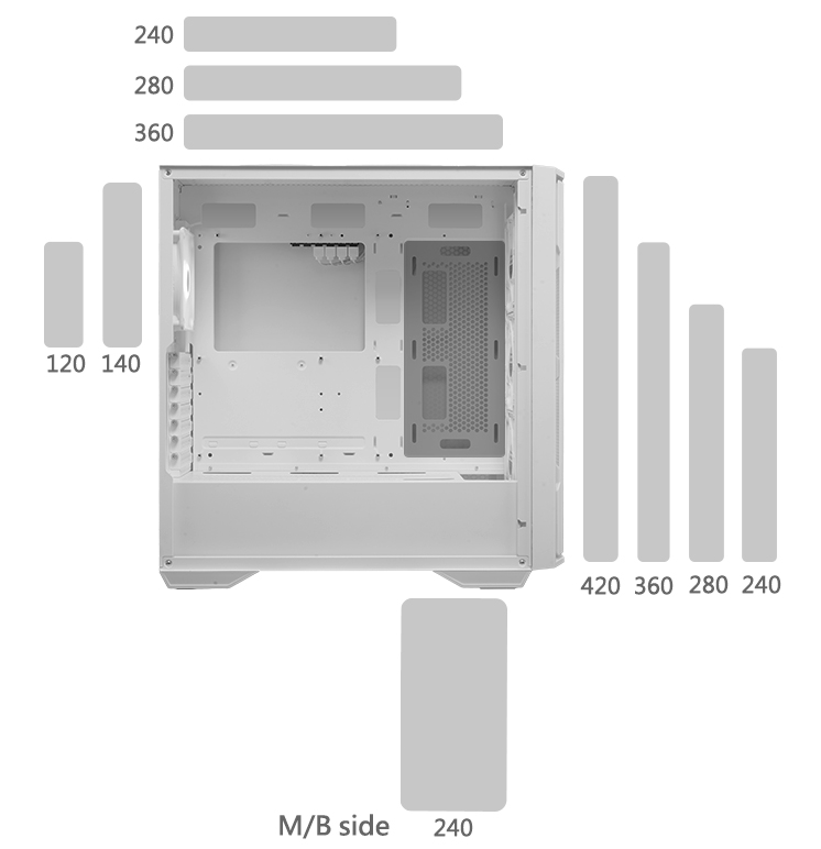 Con la opción de soporte de refrigeración por agua en el panel frontal de 420 mm o en el panel superior de 360 ​​mm, mantenga su sistema con una refrigeración óptima incluso durante tareas exigentes.