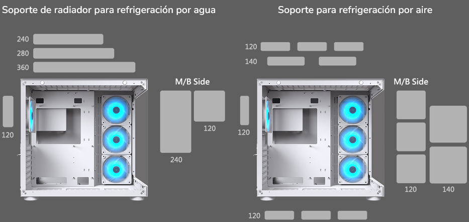 - Soporta Ventiladores 3 x 120mm / 2 x 140mm (Lado M/B)
