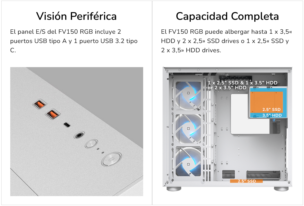 El FV150 RGB es compatible con placas madre Mini-ITX, Micro-ATX y ATX, ofreciendo flexibilidad para varias configuraciones.