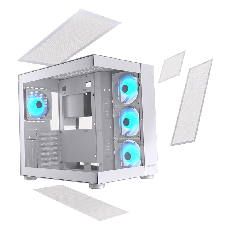 Los filtros antipolvo en los tres laterales ventilados impiden la entrada del polvo y mantienen limpios los componentes. Los filtros superiores y laterales se fijan magnéticamente, facilitando su extracción y mantenimiento.
