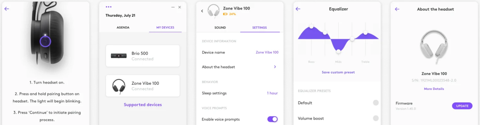 Toma el control de tu música y de la experiencia de las reuniones con Logi Tune. Ajusta el tono lateral, el nivel del micrófono y el ecualizador para lograr tu experiencia de audio preferida con el escritorio de Logi Tune o la aplicación móvil para auriculares Logitech. Además, mantén actualizados tus dispositivos e incorpórate a las reuniones con un solo clic.