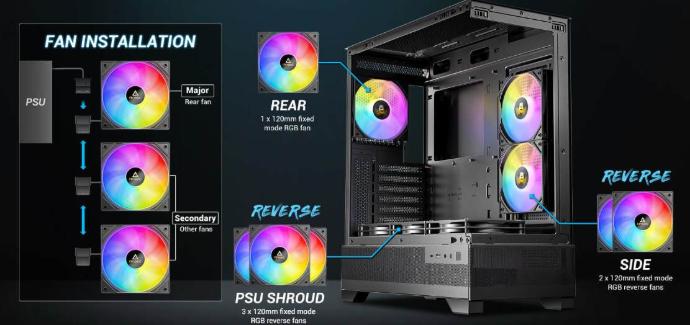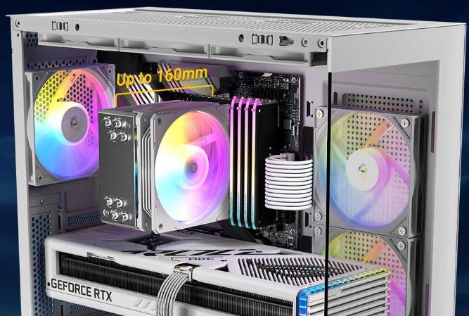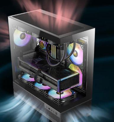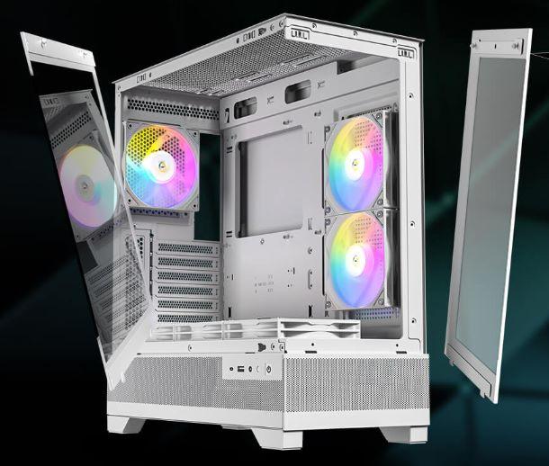 - Incluye 3 ventiladores ARGB PWM de 120 mm preinstalados (2 laterales reversos, 1 trasero)