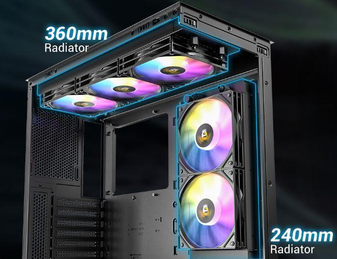 Soporta la instalación simultánea de un radiador de 360 mm en la parte superior y un radiador de 240 mm en el lateral.