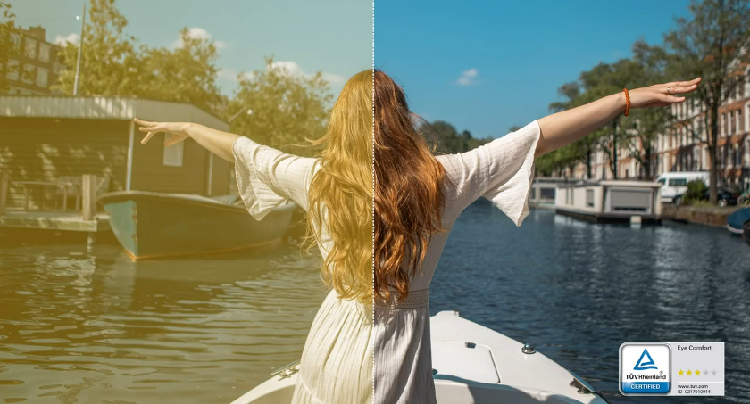 Comprueba la diferencia: ComfortView Plus ayuda a reducir los tonos amarillos para garantizar una mejor fidelidad del color en comparación con los resultados de la tecnología de reducción de luz azul habilitada por software.