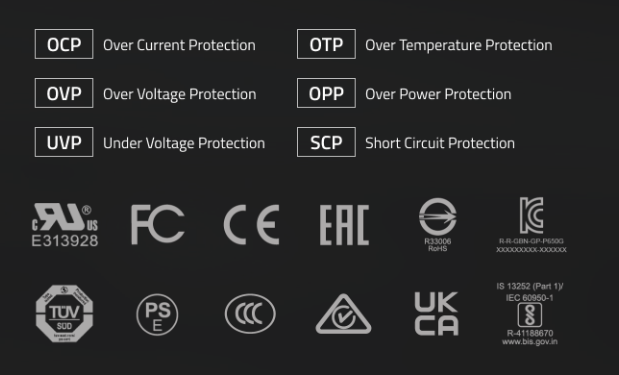Para garantizar el funcionamiento estable de todo su sistema informático en cualquier circunstancia, hemos incorporado una serie de funciones de protección, entre las que se incluyen OCP, OTP, OVP, OPP, UVP y SCP. Además, hemos obtenido certificaciones de seguridad de varios países para garantizar el funcionamiento constante y seguro de su sistema.