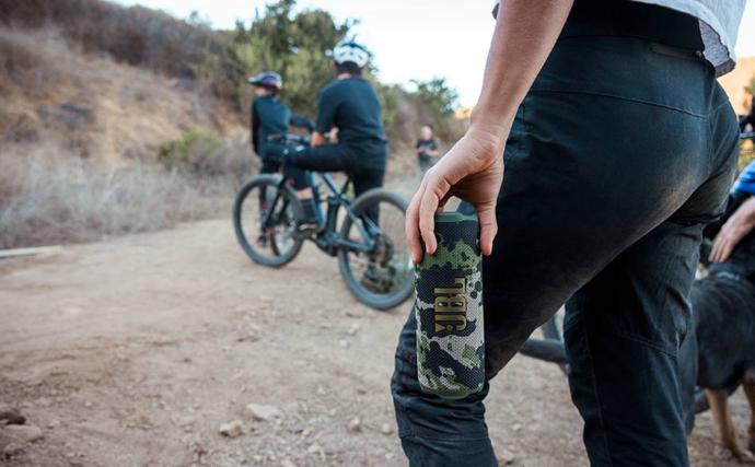 La rejilla del altavoz JBL Flip 7 incorpora un 77 % de plástico reciclado posconsumo y tejido 100 % reciclado. El embalaje es de papel con certificación FSC y tinta de soja.
