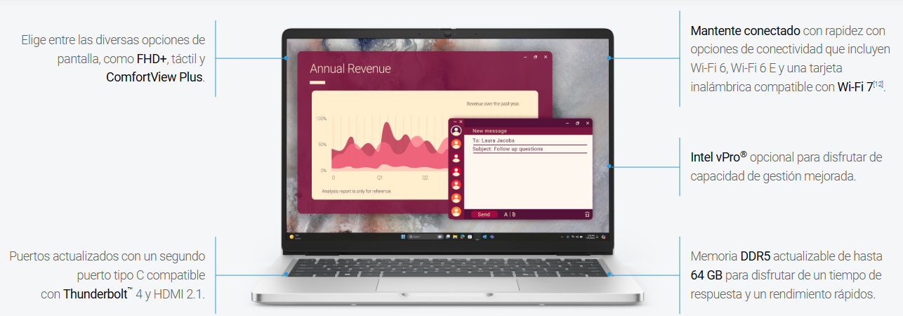 Gracias a una amplia pantalla de 16:10 con marcos más estrechos, un 5 % más de área en el mismo tamaño y un 10 % menos de peso, te permite trabajar de forma más productiva, con la vista más despejada y con más detalles