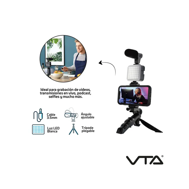 Kit Vlogger VTA, para los amantes a la tecnología y redes sociales, versátil para grabación de videos, transmisiones en vivo e incluso selfies y fotografía. Incluye: Trípode ajustable, soporte para smartphone, lámpara LED y micrófono.